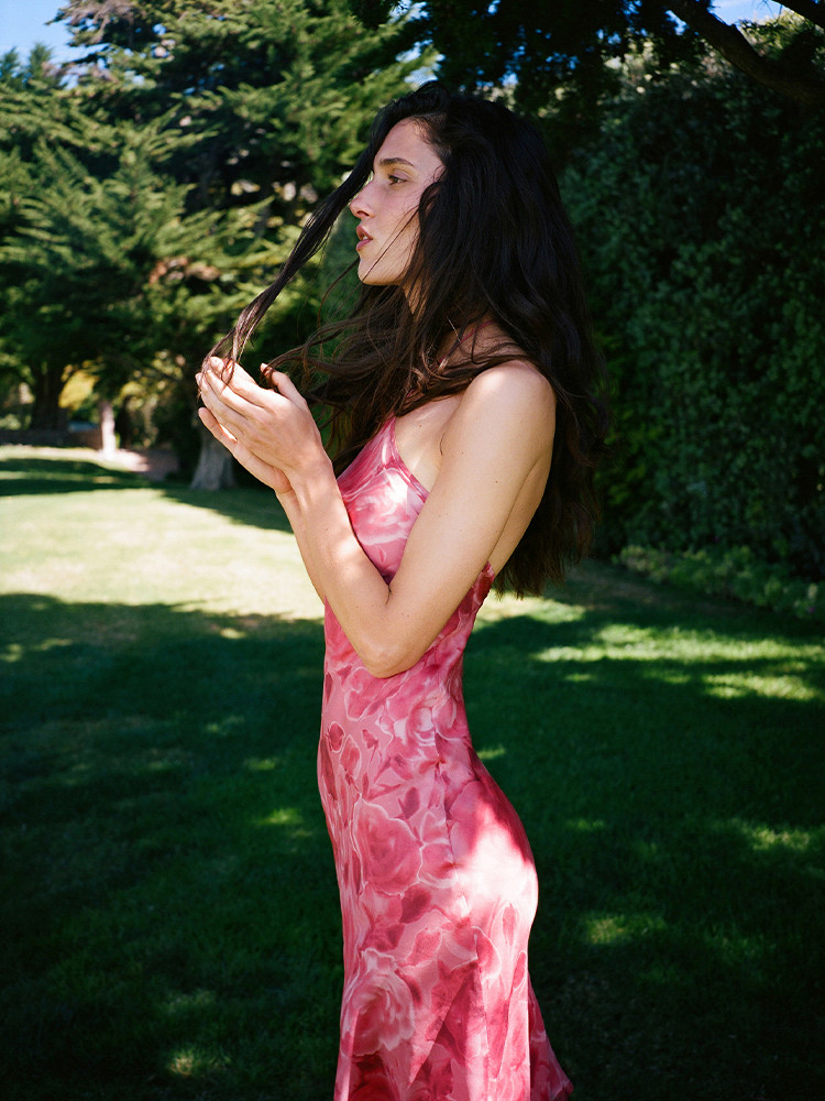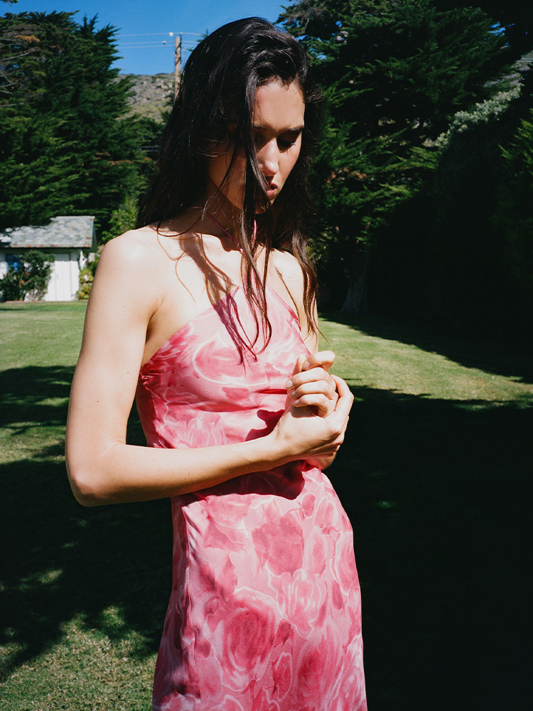 The halter dress that's going to have you moving and shaking. A diamond pointed neckline and low back with a thin rouleau strap to tie at the nape of your neck. She's sexy and double layered - printed on the top and plain underneath giving you total coverage. Midi in length and cut on the bias to slip on and hug your curves just where you want it.