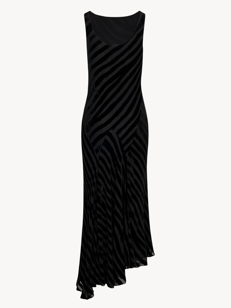 The sleeveless midi with a high neckline and draped skirt in slinky, striped devoré velvet is as luxe as she looks. Bias-cut to flatter every Dreamgirl shape and lined in silk georgette, The Romy moves just the way you want her to - chic and elegant. She’s the one you reach for when you need that perfect event dress.